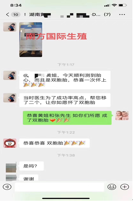 湖南黄姐是听朋友说我们的成功率和双胞胎率都非常高,我们的后勤团队及胚胎制作技术都非常完善和成熟,慕名来到我们南方国际生殖中心毫不犹豫选择相信我们,我们不负黄姐夫妇所望一次怀上双胞胎!隔着屏幕都能感受到满满的幸福喜悦